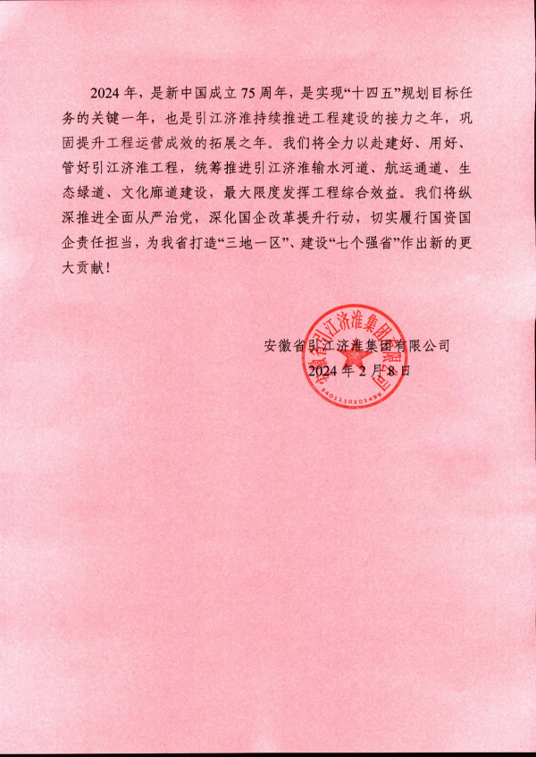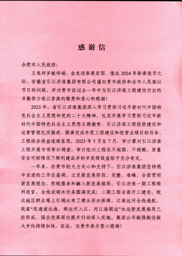 日月春暉漸,光華萬物新。不久前,省引江濟(jì)淮集團(tuán)有限公司向合肥市發(fā)來感謝信。信中指出,“一年來,在貴市的大力關(guān)心和支持下,引江濟(jì)淮一期工程順利收官,全線試調(diào)水任務(wù)圓滿完成;二期工程全面開工建設(shè),皖北地區(qū)群眾喝上引調(diào)水有了源頭活水保障。江淮運(yùn)河全線通航,我省‘雙通道達(dá)海、兩運(yùn)河入江、河江海聯(lián)運(yùn)’水運(yùn)新發(fā)展格局已經(jīng)形成。在此,向貴市表示衷心感謝!”
