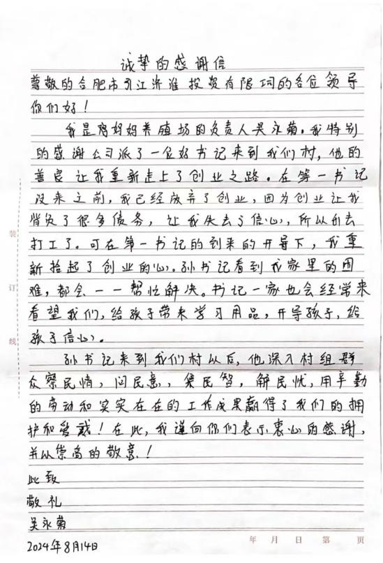 “孫書記看到我家里的困難,都會一一幫忙解決,孫書記用辛勤的勞動和實實在在的工作贏得了我們的擁護和愛戴!”近日,長豐縣莊墓鎮(zhèn)棗林社區(qū)村民吳永菊,在給公司第八批選派干部,時任棗林社區(qū)第一書記的孫玉同志的感謝信中這樣寫道。她對市引江投資公司一直以來的關心幫助,和駐村書記孫玉同志三年以來的辛勤付出致以誠摯的感謝,并為公司和孫玉同志送上印有“為民選派好領導 盡心盡力辦實事”“黨的好干部 群眾貼心人”的錦旗。