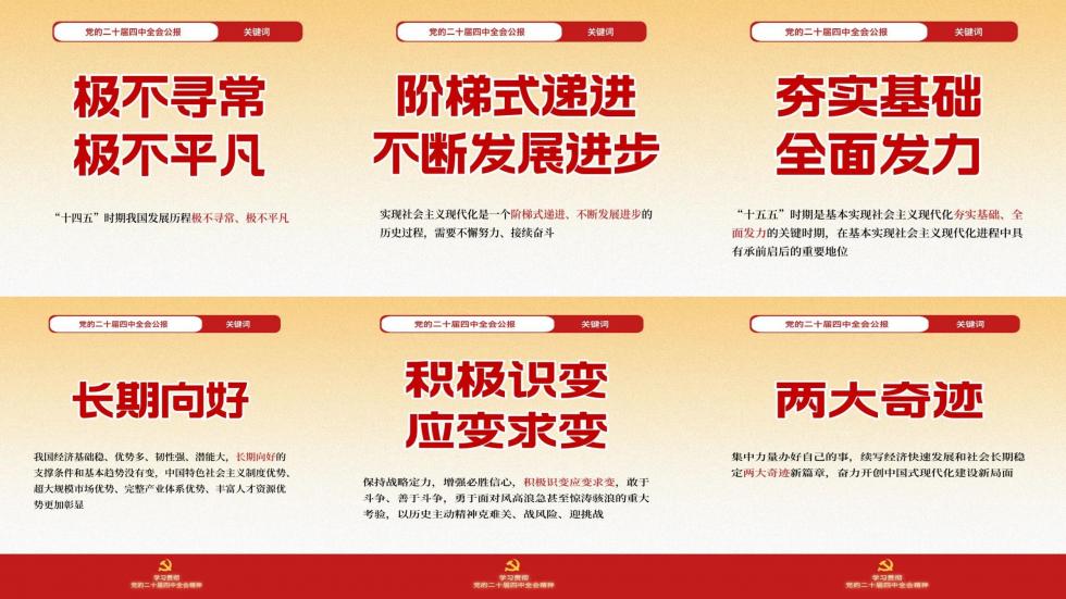 查看詳細(xì) +中國共產(chǎn)黨第二十屆中央委員會第四次全體會議公報(2025年10月23日中國共產(chǎn)黨第二十屆中央委員會第四次全體會議通過)中國共產(chǎn)黨第二十屆中央委員會第四次全體會議,于2025年10月20日至23日在北京舉行。全會由中央政治局主持。中央委員會總書記習(xí)近平作了重要講話。全會聽取和討論了習(xí)近平受中央政治局委托所作的工作報告,審議通過了《中共中央關(guān)于制定國民經(jīng)濟和社會發(fā)展第十五個五年規(guī)劃的建議》。習(xí)近平就《建議(討論稿)》向全會作了說明。全會充分肯定黨的二十屆三中全會以來中央政治局的工作。一致認(rèn)為,中央政治局認(rèn)真落實黨的二十大和二十屆歷次全會精神,堅持穩(wěn)中求進工作